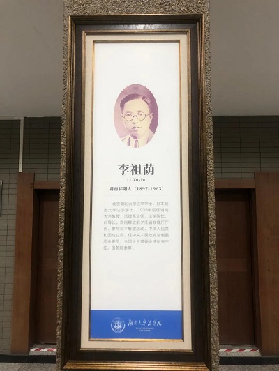 大厅里四根柱子上,分别陈列着李祖荫、李达、黄右昌、周枏四位法学名贤的生平事迹,以示铭记。