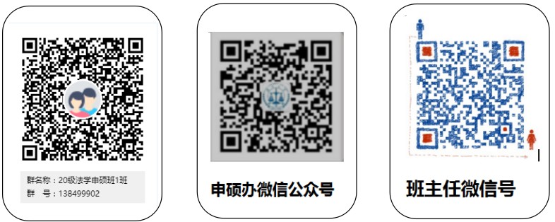 3,请扫码加入班级QQ群、关注申硕办微信公众号、添加班主任微信号。QQ入群后请各自修改自己的群名片。模板格式为:(所在地)XX(名字)XX。QQ群资料文件夹里会保存相关学习资料以供同学随时下载使用;申硕办微信公众号会随时更新学院办公室教务动态;通过班主任微信可无障碍沟通学习相关事宜。