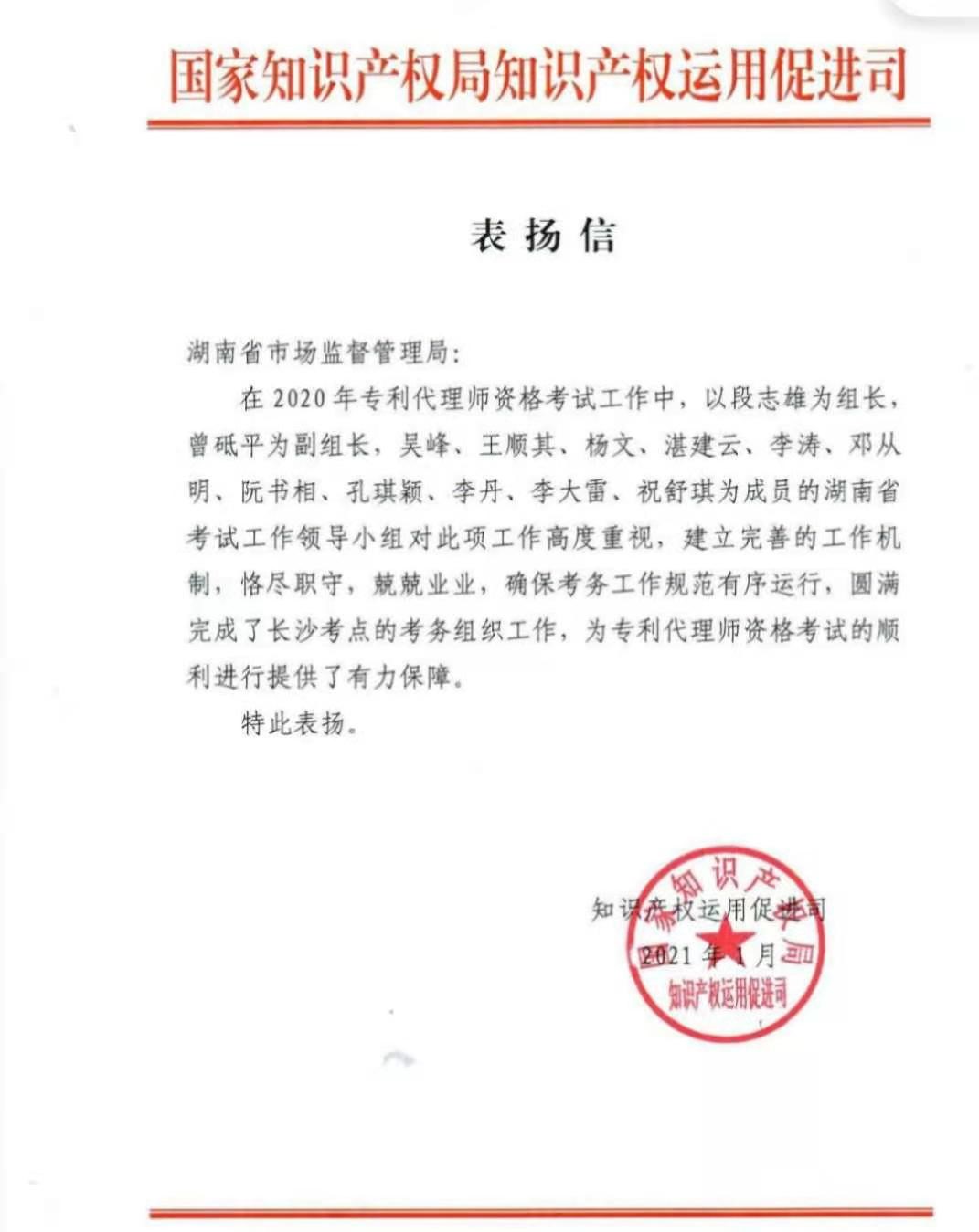 信中提到在2020年专利代理师资格考试工作中,以段志雄为组长,曾砥平为副组长,吴峰、王顺其、杨文、湛建云、李涛、邓从明、阮书相、孔琪颖、李丹、李大雷、祝舒琪为成员的湖南省考试工作领导小组对此项工作高度重视,建立完善的工作机制,恪尽职守,兢兢业业,确保考务工作规范有序运行,圆满完成了长沙考点的考务组织工作,为专利代理师资格考试的顺利进行提供了有力保障。
