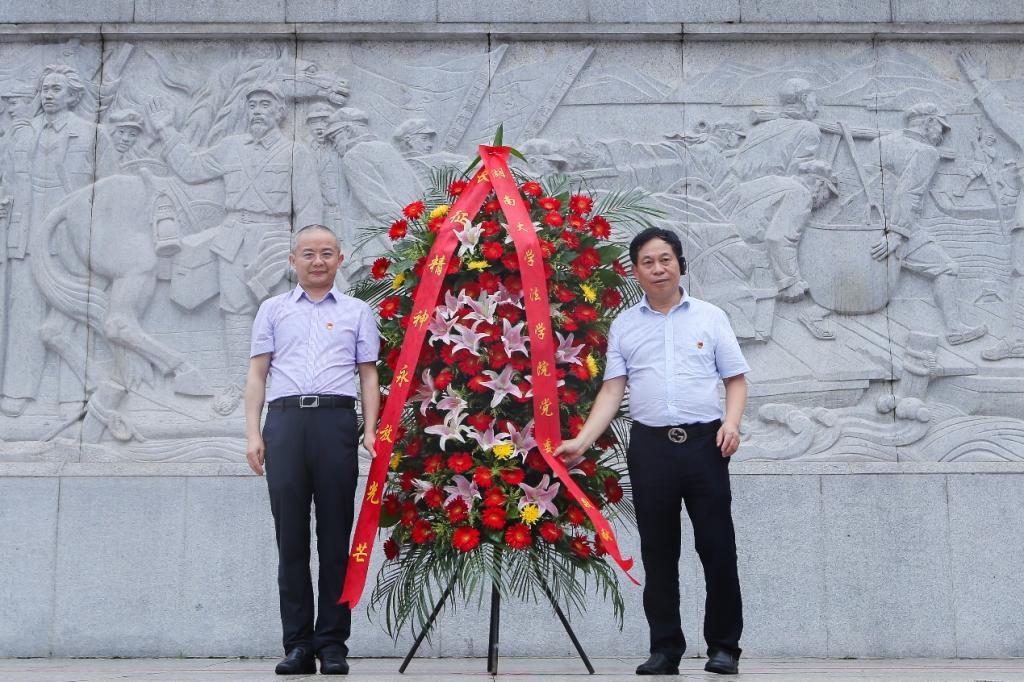 在中央红军长征出发纪念碑前,院党委书记易骆之、院长黎四奇代表91论坛