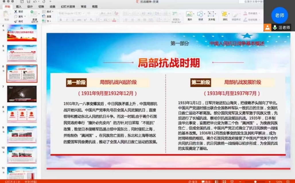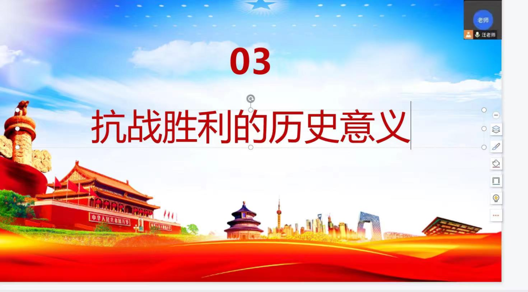 最后,汪全军老师总结抗战胜利的历史意义。他指出这是一场促进民族觉醒和团结的战争,是改变国家命运的战争,更是推动中国新民主主义革命历史进程的战争。随后,汪全军老师列举一系列真实数据,让同学们对抗日战争有了更具体的认知。
