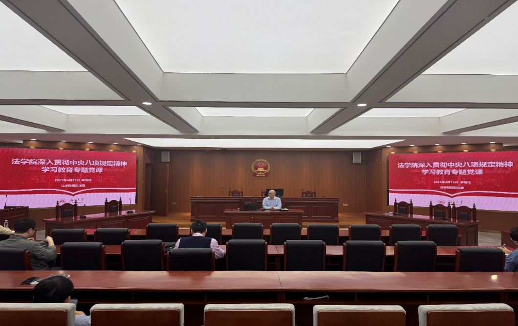 组织全体教职工在模拟法庭进行了以“学习贯彻中央八项规定精神”为主题的专题党课学习,院党委书记李劲松为全体教师授课。
