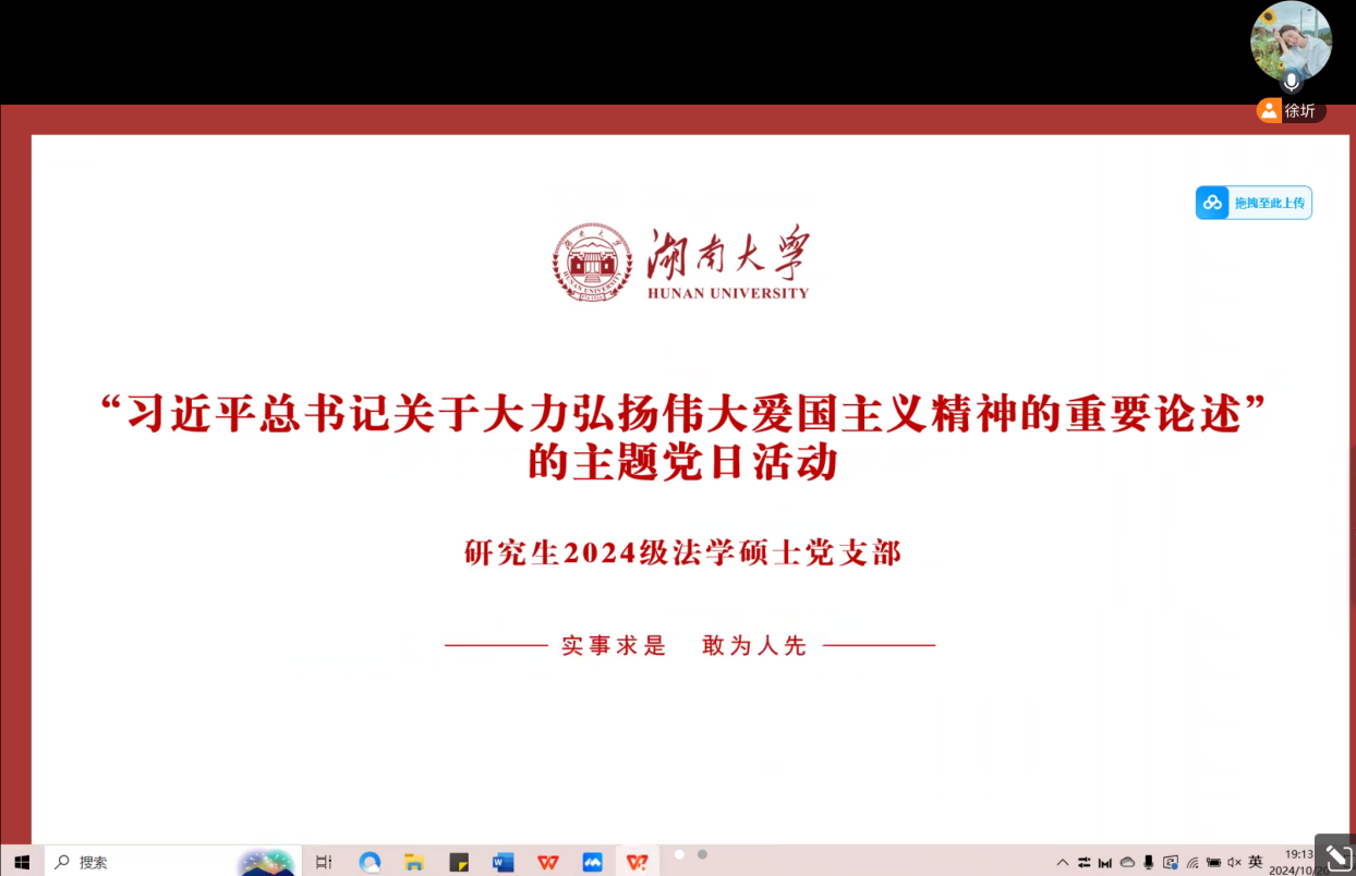 研究生2024级法学硕士党支部于10月20日通过腾讯会议的形式,开展了“学习习近平总书记关于大力弘扬伟大爱国主义精神的重要论述”的主题党日活动。活动由党支部书记徐圻主持,支部全体党员同志参加。